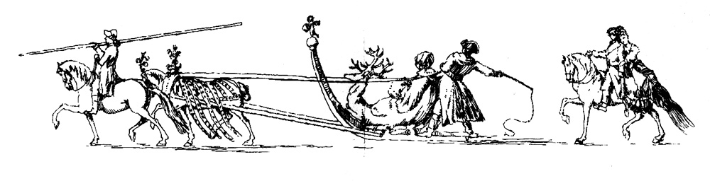 Kulig taki, coraz to liczniejszych mający uczestników, wędrował od dworu do dworu popasając, bawiąc się i goszcząc nieraz i po kilka dni. Była to okazja do odwiedzin familijnych, do poznania się młodych i do wielu radości, popisów uciech i psot. Nade wszystko była to okazja do błyśnięcia dowcipem i dobrym pomysłem na saneczki, które musiały być niezwykłe. Rzeźbiono więc sanie w kształcie niedźwiedzia, jelenia, konia koguta, łabędzia, lwa, muszli i fantastycznych stworów. Nieraz były to całe kompozycje wielofiguralne, głowy murzynka na rufie albo ptaka rajskiego, papugi, węża itp. Nawet w największym tłoku każdy łatwo rozpoznawał swoje sanie. Po leśnych, wąskich drogach pędziły zaprzęgi jednokonne. Zazwyczaj dama siedziała w saniach opatulona baranicą i kapłonim zarękawkiem (mufką z piór kogucich), a mężczyzna powoził z tylnego koziołka. Obejmując damę serca chronił ją swymi ramionami, szepcząc czułe słówka prosto do ucha.