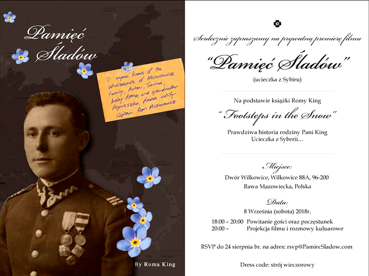 Ktoś dał moją książkę dyrektorowi Studia Filmowego WIR w Warszawie. Po przeczytaniu zgłosił się do mnie, z pytaniem, czy wyrażę zgodę na realizację filmu fabularno-dokumentalnego na podstawie swojej książki. Ależ TAK, oczywiście – z radością się zgodziłam. I tak zaczęła się długa współpraca. Byłam w Polsce w 2016 i w 2017 r., udzielałam wywiadów i uczestniczyłam w planach filmowych. A we wrześniu 2018 r. przyjechałam na uroczystą premierę filmu w kinie Muranów w Warszawie, która odbyła się 18 września. 8 września natomiast odbył się, niezwykle pięknie zaaranżowany przez moją przyjaciółkę Martę Kaczkowską, przedpremierowy pokaz filmu w dworze Wilkowice koło Rawy Mazowieckiej. Byłam wzruszona, dwór, jak mojego dziadka pod Wilnem. Obok posesji wspaniała winnica, z której wina są eksportowane do wielu europejskich krajów. Moja przyjaciółka zaprosiła ekipę filmową i wielu znakomitych gości. Przyszło 135 osób. Było bardzo elegancko, do tego wytworna kolacja, kelnerzy podający do stołu. I nie kończące się rozmowy. To był wspaniały wieczór, którego nigdy nie zapomnę.