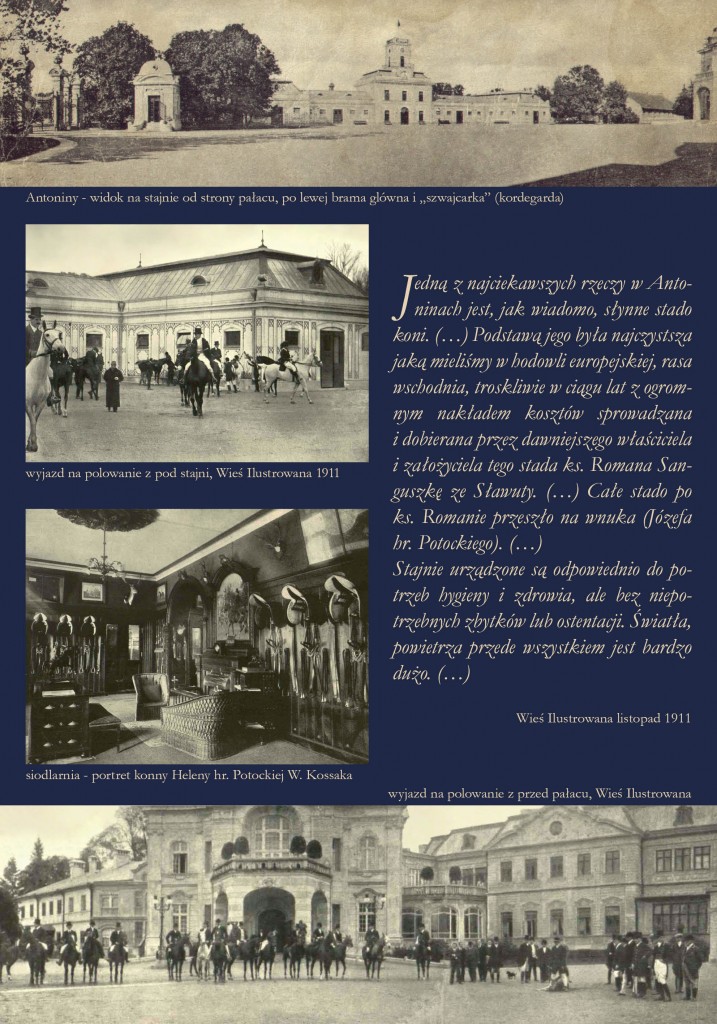 bolszewickiego. Zofia Kossak-Szczucka, naoczny świadek tych wydarzeń, w latach 1917-1919 prowadziła dziennik, który opracowała i wydała w 1922 r. Dokonany przez nią zapis „Pożogi” do dziś poraża ogromem nienawistnego, bezmyślnego niszczenia wszelkich przejawów cywilizacji i kultury. Mąż pisarki, Stefan Szczucki, przed pierwszą wojną światową zarządzał innym majątkiem Potockich w pobliskiej Nowosielicy. Antoniny, siedziba Józefa Mikołaja Potockiego, były nie tylko miejscem częstych odwiedzin, ale także stawały się w najbardziej niebezpiecznych momentach miejscem schronienia dla młodego małżeństwa z dziećmi. Pisarka nie tylko zostawiła opis wielkości wspaniałej rezydencji i nowoczesnej osady oraz wzorowo zagospodarowanego i prowadzonego na europejskim poziomie majątku, ale odnotowała także zabiegi licznej rzeszy pracowników ordynacji, usiłujących obronić to niezwykłe miejsce, jak samotną wyspę, otoczoną zewsząd nawałnicą bolszewizmu.