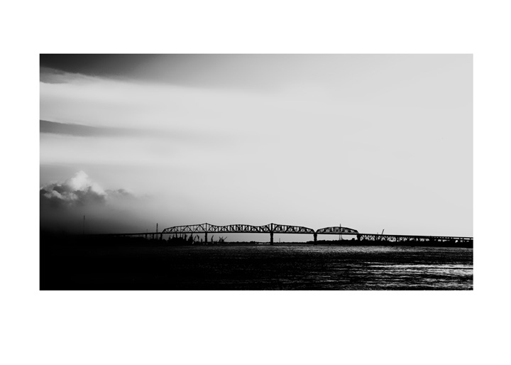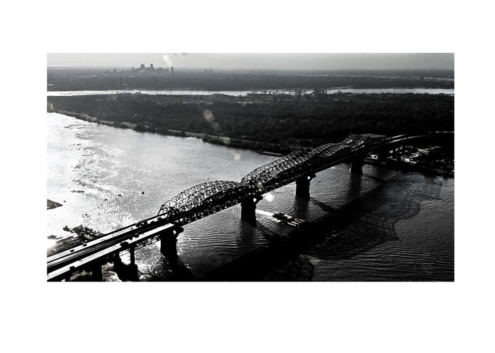 Leonard Myszyński z helikoptera filmuje Government Bridge na rzece Mississippi, 2013 r., fot. Brudos Sommers.