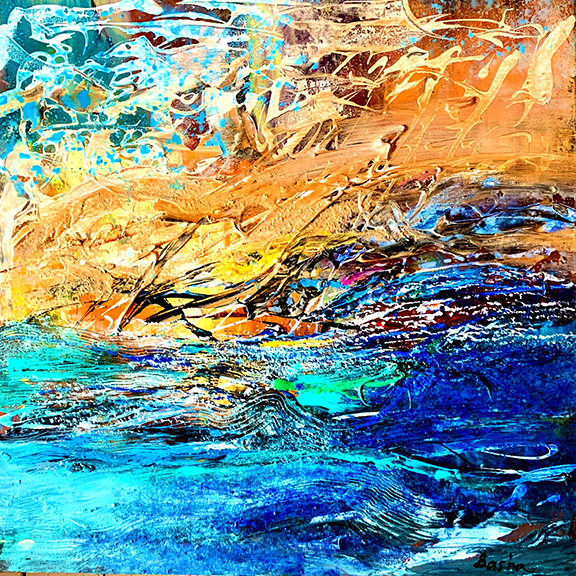 Ocean Talks, acrylic, mixed media on canvas, 24×24 in