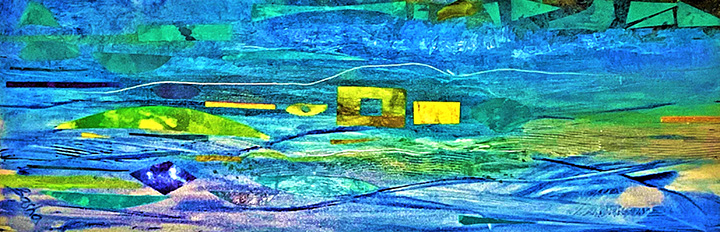 Stillness and Happiness, acrylic on canvas, 20×16 inSun in the Park, assemblage, acrylic, mixed media on canvas, 42×39 in
