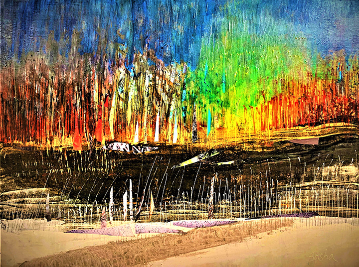 Sunset in the Park I, assemblage, acrylic, mixed media on canvas, 30×40 in