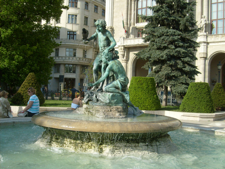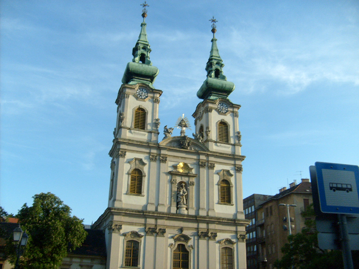 Sobota, 5 maja, ostatni dzień w Budapeszcie. Kálmán zachęca mnie do wyjazdu po obiedzie do centrum miasta. Wysiadamy z tramwaju przy Centrum Sztuki, zwanym także Redutą (Vigadó). Przed eleganckim budynkiem fontanna z rzeźbami dwóch bawiących się chłopców, zbudowana w roku 1896 i zaprojektowana przez Károly Senyei. Prawdziwy kruk pije wodę z ręki jednego z chłopców. Przypominam sobie, że byłem już w tym budynku na parterze. Windą na szóste piętro. Sala wystawowa z niezbyt ciekawym malarstwem nowoczesnym. Na pierwszym piętrze piękna sala koncertowa z łukami i ozdobnym plafonem z witrażem. Pieszo do barokowego Kościoła Śródmiejskiego (Templom Bellvárosi, Plébania Templom), przed którym na smukłych kolumnach św. Kinga i św. Jadwiga. Wewnątrz dość pusto, mało ozdób. Najciekawsza jest wyeksponowana w kaplicy po lewej stronie dziergana złotymi nićmi szata liturgiczna. Po prawej, renesansowy, dyskretny ołtarzyk z różowego marmuru.