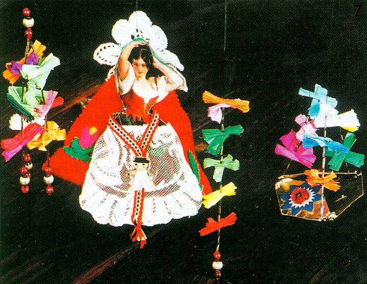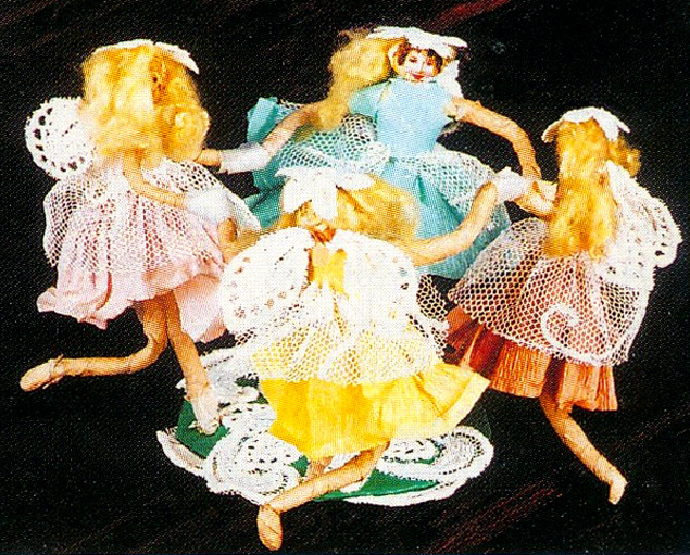 Duchową radość z narodzenia Zbawiciela uosabiają choinkowe aniołki wykonane różnymi sposobami z rozmaitych materiałów – od niciano-szydełkowych, po słomiane i z kukurydzianych kaczanek. W moim zbiorze do najstarszych należą te, które wiesza no na szczycie choinki, pod gwiazdą, w zależności od wysokości drzewka. Jest to papierowy anioł, przedstawiony jako uskrzydlona główka, otoczona autentycznymi piórkami, z gwiazdką ze srebrnych drucików. Około 1900 r. powstała całopostaciowa grupa tańczących aniołków, wykonanych z kolorowych bibuł i haftowanego tiulu. Czynienie dobra i bezinteresowną pomoc bliźniemu utożsamiają także różne baśniowe postacie, jak: krasnoludki, Królewna Śnieżka, grający świerszcz i lato, Królowa Śniegu jako personifikacja zła. Nastrój karnawałowej zabawy wzmacniały inne figurki epoki fin de siecle’u, np. pajacyk, Japoneczka, dwaj Chińczycy oraz Carmen.