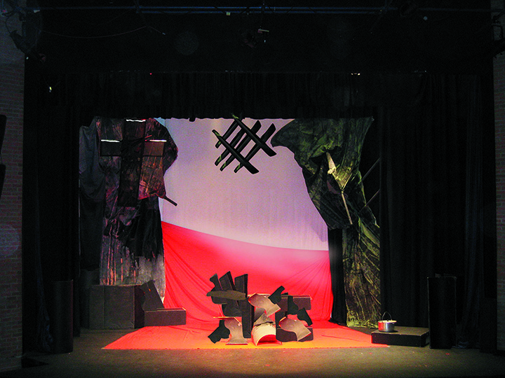 Symboliczna, wymowna i oszczędna scenografia grała swoją rolę. W tle polska flaga. Czerwona jej połowa spoczywała na ziemi, jako symbol przelanej krwi, a biała część, jako na­dzieja wznosiła się w niebo. Przeważała wojskowa kolorystyka khaki, w kształcie  prosta i symboliczna. Drzewo i krzyż, kawałki dachówki, domu, muru, rzucone bezładnie na scenę, mogły odgrywać różne role – barykady w pierwszej części, schronu, czy piwnicy w drugiej części. Dramatyzmu dodawały przenika­jące scenę fragmenty doku­mentalnych kronik powstańczych.