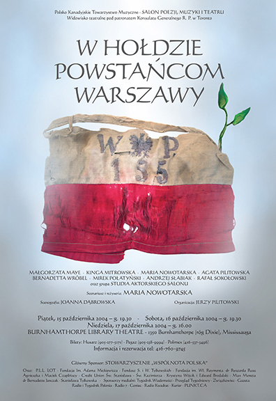 [1] W hołdzie Powstańcom Warszawy. Scenariusz i reżyseria: Maria Nowotarska. Występują: Małgorzata Maye, Kinga Mitrowska, Maria Nowotarska, Agata Pilitowska, Bernardetta Wróbel, Mirosław Połatyński, Andrzej Słabiak, Rafał Sokołowski oraz grupy Studia Aktorskiego Salonu „SAS” i „SAS” – junior. Scenografia: Joanna Dąbrowska. Organizacja: Jerzy Pilitowski. Prapremiera: 15 października 2004, Burnhamthorpe Library Theatre, Mississauga.