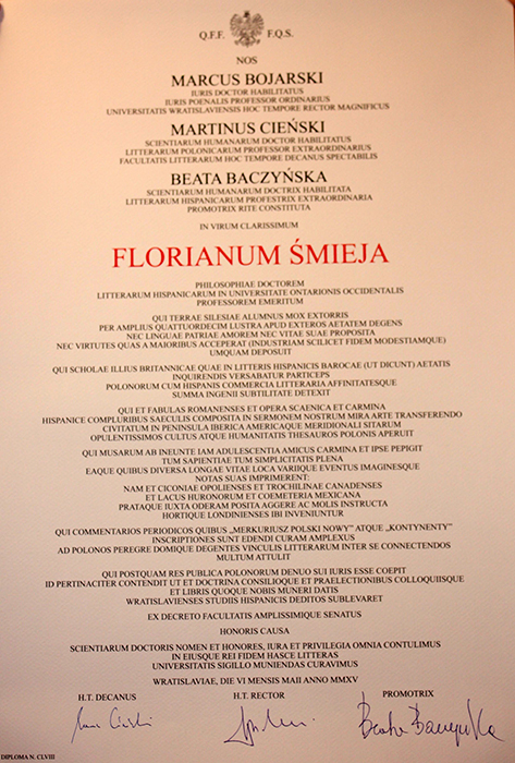 Na początku lat 90. prof. Florian Śmieja, z inicjatywy prof. dr. hab. Piotra Sawickiego, nawiązał stałą współpracę z Uniwersytetem Wrocławskim, wspierając wiedzą i doświadczeniem młody zespół Zakładu Iberystyki w Instytucie Filologii Romańskiej. Od roku akademickiego 1991/92 do 1996/97 gościł we Wrocławiu co roku, prowadząc w semestrze letnim wykłady i seminaria z literatury hiszpańskiej i latynoamerykańskiej w Instytucie Filologii Romańskiej oraz zajęcia z literatury emigracyjnej w Instytucie Filologii Polskiej.