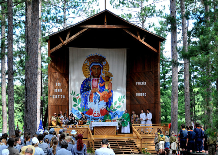 W roku 1953 władze franciszkańskie oraz lokalny biskup zgodzili się na założenie Ośrodka mianując ks. Grzondziela jego kierownikiem. 2 sierpnia 1953 roku odprawił on pierwszą Mszę św. w nowopowstałej kaplicy. Z czasem kaplica nie mogła pomieścić wszystkich wiernych i zapadła decyzja, by niedaleko na cyplu nad jeziorem wybudować kaplicę z zadaszonym ołtarzem. W lasku przed tą kaplicą było dosyć miejsca dla wszystkich. I tak powstała funkcjonująca w lecie “Katedra pod sosnami”.