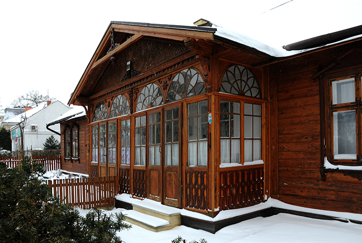 Prawdziwą ozdobą budynku jest okazały przeszklony ganek na środku elewacji frontowej. W jego trójkątnym szczycie, oszalowanym w drobną łuskę, umieszczono symetrycznie parę zwróconych ku sobie bocianów, wyciętych z drewna i malowanych. Od tej ozdoby do drewnianego modrzewiowego domu przylgnęła nazwa Pod Bocianami. W dużych, zamkniętych łukiem, przeszklonych oknach i drzwiach ganku wprowadzono drobne regularne podziały geometryczne, a pod oknami w szalunku – profilowo wycięte ornamentalne deskowanie. Niezwykle bogate jest obramienie okien budynku. W elewacji frontowej umieszczone po obu stronach ganku, po dwie bliźniacze pary otworów okiennych flankowane są kanelowanymi smukłymi półkolumienkami i zwieńczone trójkątnymi, wycinanymi z desek szczytami; w dolnej części wsparcie dla kolumienek dają snycerowane konsolki, połączone toczonym wałkiem – rodzajem parapetu z podwieszonym ażurowym, wycinanym ornamentalnie fartuszkiem pod każdym oknem.