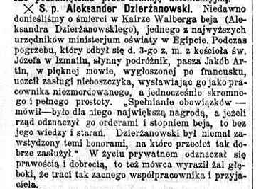 Aleksander opublikował również kilka prac dotyczących szkolnictwa. Podpisywał się jako Aleksander Walberg – Dzierżanowski Bej. Otrzymał bowiem tytuł bej (tur. – bey), nadawany wyższym urzędnikom na terytorium państw tureckich. Wiem tylko tyle, że pochowany został w koptyjskim kościele w Kairze, natomiast jego żona Zofia, najprawdopodobniej powróciła do Polski. Niestety, wciąż nic mi nie wiadomo o ich potencjalnym potomstwie i dalszych losach Zofii Dzierżanowskiej. I jak tutaj przejść obojętnie obok tak barwnej postaci? Nie pozostaje mi nic innego, jak napisać list, nalepić znaczek i wysłać go do kairskiego kościoła. Niestety, mimo iż intensywnie szukałem, ani na jego stronie internetowej, ani w Internecie, nie ma śladu po adresie mailowym tego koptyjskiego kościoła… No cóż, w końcu to jedna z najstarszych, wciąż działających instytucji na świecie. Jak widać, w XXI wieku takie szacowne instytucje mogą doskonale funkcjonować bez posiadania adresu mailowego …