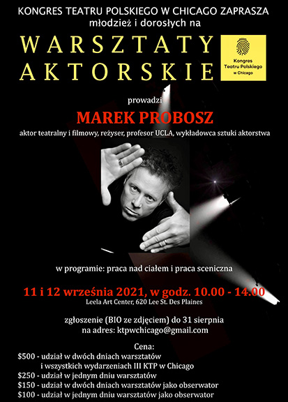 W piątkowy wieczór, na widowni zebrali się ludzie, których pasją jest teatr i którzy dla teatru poświęcają swój wolny czas. Wśród zgromadzonych znalazła się także pani Paulina Szafałowicz, przedstawicielka Konsulatu RP w Chicago, kierowniczka referatu ds. Prawnych i Opieki Konsularnej. Warto tu wspomnieć, że Konsulat od początku finansowo wspierał i wspiera działalność Kongresu Teatru Polskiego, za co chicagowskie środowisko teatralne jest mu niezmiernie wdzięczne. Głównym gościem Kongresu był jednak, również obecny na widowni, przybyły na zaproszenie Andrzeja Krukowskiego, aktor, reżyser, scenarzysta i wykładowca na prestiżowym Kalifornijskim Uniwersytecie w Los Angeles, UCLA, Marek Probosz. I to właśnie on poprowadził warsztaty teatralne dla aktorów.