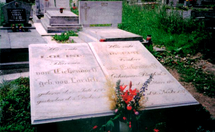 W czasie swego pobytu w Berlinie Eichendorff zakończył pracę publiczną i wraz z żoną Aloisą von Larisch osiedlił się w Nysie, zamieszkując w piętrowym domu (zniszczonym w 1945 r.) przy obecnej ulicy Bartosza Głowackiego. Poświęcił się tu całkowicie pisaniu. Oboje zmarli w tym domu: żona – 3 XII 1855 r., on sam – 26 XI 1857 r. Pochowani są w grobowcu rodzinnym na tzw. cmentarzu jerozolimskim w Nysie przy małym kościółku św. Krzyża położonym przy wylotowej ulicy Mieczysława I, prowadzącej do Otmuchowa. Grób jest zadbany, odwiedzany też często przez niemieckich turystów, którzy czczą pamięć Eichendorffa.