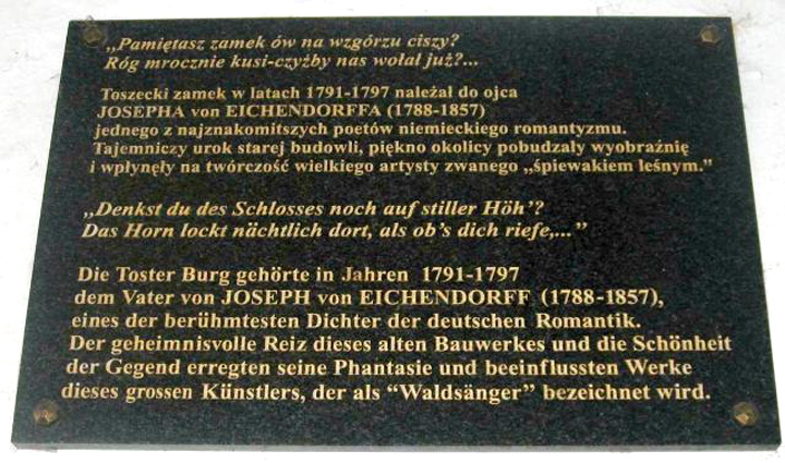 Podczas wędrówek po Jurze Krakowsko-Częstochowskiej w czerwcu 2006 roku natknąłem się na tablicę pamiątkową na zamku w Toszku poświęconą Eichendorffowi.