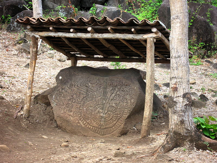 Czwartek, 29 stycznia. Dziś w planie słynne petroglify. Trasa wiedzie od Altagracia przez Balgües do hacjendy Magdalena na zboczach wulkanu Maderas. W istocie, co kawałek głaz z wyrytymi spiralami, kołami, rozmaitymi figurami geometrycznymi, a nawet schematycznymi postaciami ludzi i zwierząt. Takich miejsc na wyspie jest więcej i dzięki temu zyskała sobie miano wyspy „spiral i kół”. Petroglify są, obok posągów z „alter ego”, kolejnym świadectwem obecności Chorotegów i uchodzą za ich kamienną biblię. Ścieżka wznosi się łagodnie i otwiera się widok na to wewnętrzne nikaraguańskie „morze”  i zielone brzegi wyspy. Oglądam te petroglify w towarzystwie turysty z Argentyny. Im wyżej, tym więcej ozdobionych ciekawymi rytami głazów.