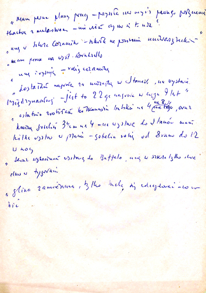 Z wyjątkiem jednej – najbardziej opóźnionej – zgłoszonej mi osobiście już w końcu czerwca – nie do odparcia. Tą nadprogramową reflektantką była bowiem nasza świetna artystka – tkaczka, laureatka Wystawy paryskiej 1937 roku – gdzie zademonstrowała z grupą Ład piękną makatę p.t. „Wegetacje” – Krystyna Kopczyńska. Taki był początek naszej ówczesnej krótkotrwałej znajomości i długiej, bo dotąd przetrwałej, przyjaźni.