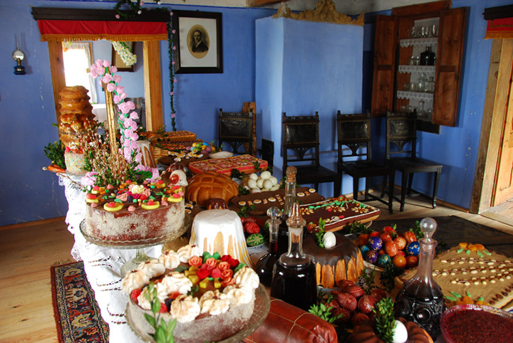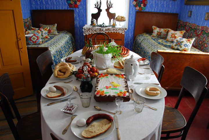 A czas już wielki, abym Waszeci opisał – tak tytułuje mąż żonę – com widział i pożywał na święcone u Imci pana Mikołaja Chroberskiego rajcy, mieszczanina utściwego (…). Stół okrągły na środku, wieki, dębowy, żeby stu ludzi koło niego wygodnie siadło i jadło. Obrus na nim jeden wielki, ale w krzyż zaszywany. Na sześciu misach srebrnych, roboty wspaniałej, były mięsiwa wieprzowe z zad. Na drugich sześciu było dwoje prosiąt okrąglutkich, kiełbasy najmniej po cztery łokcie długie, a dziwnie pachnące i koloru krokoszowego, ciemnego ustrojone rzędami jaj święconych i pisanek pomalowanych w przeróżnej barwie, ale najwięcej na rakowe. Mięsiwo miało cudną powłokę z tłuszczu w różową barwę wpadającą. Pomiędzy tymi misami stały figury z ciasta przedniego, wyobrażające dziwnie zabawne historyjki. Poncyusz Piłat wyjmował kiełbasę z kieszeni Mahometa, a wiadomo, że Żydzi i Turcy nie jedzą wieprzowiny, więc to na nich epigramma były pocieszne. Na samym środku stołu stał dziwnie piękny baranek z masła wielkości naturalnej owieczki (…)
