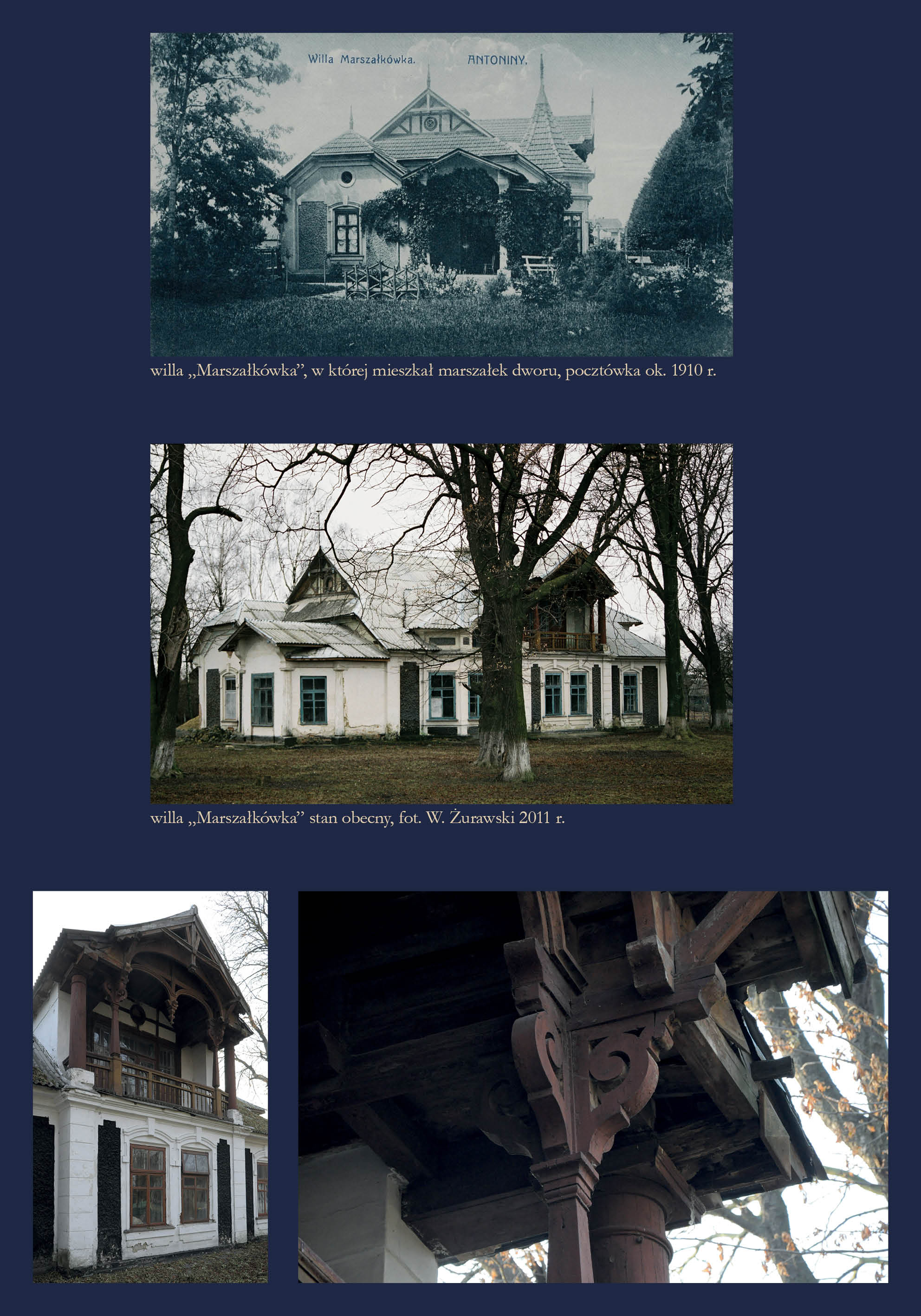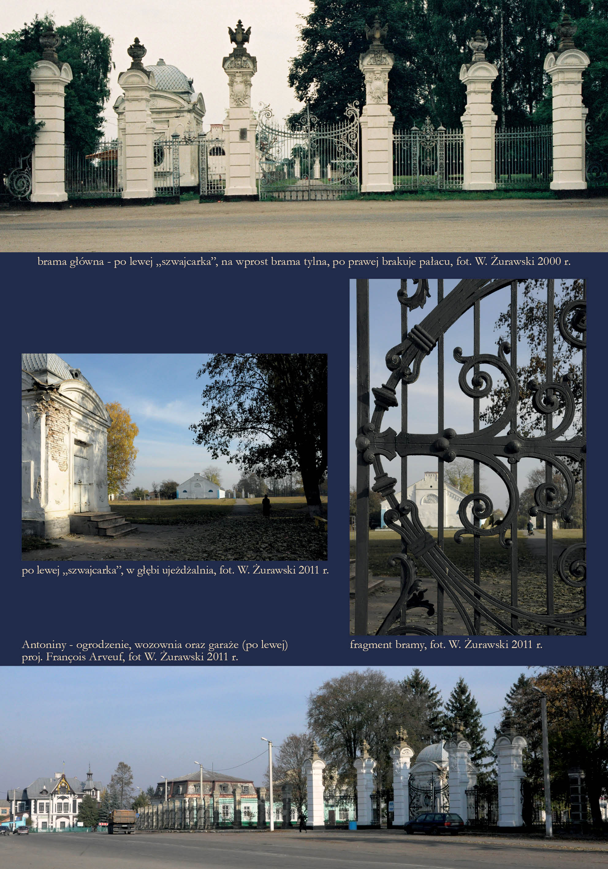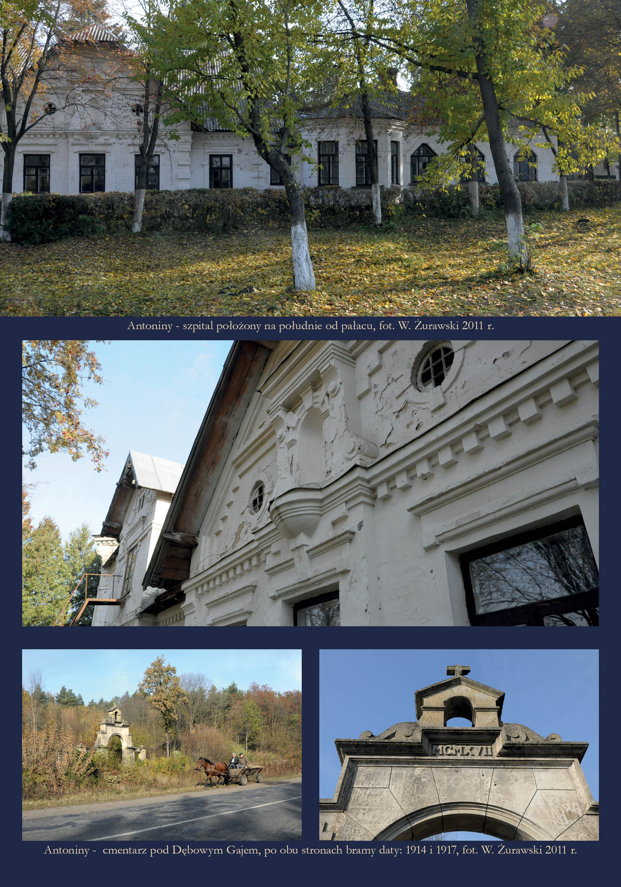 Wbrew pozorom, pomimo licznych zniszczeń, Antoniny przetrwały. Były zbyt potężne, zbyt wspaniałe, by dać się zmieść bezmyślnej nienawiści. Odkrywamy je wraz z mężem okaleczone i wciąż dumne w kolejnych naszych podróżach na Ukrainę. Odczytujemy pozostałości, mniej lub bardziej wyraźne ślady. Stojąca nad stawem malownicza willa, mieściła na parterze kasyno dla oficjalistów z salą bilardową, a na piętrze – mieszkanie koniuszego Kadish’a (Kadich’a), a później dyrektora stada – austriackiego rotmistrza Löffler’a. Dlatego nazywana była „Kadiszówką” lub Leflerówką”. Obok niej willa “Marszałkówka” zajmowana przez marszałka dworu, dalej piętrowa willa weterynarza i stajnie gościnne, nazywane także szpitalem dla koni, naprzeciwko willa zarządu cukrowni w Kremenczukach, a na końcu skweru hotel, w którym zatrzymywali się interesanci Józefa Potockiego. W obrębie ogrodzenia pałacu stoją do dziś budynki wozowni, oficyny i maneżu. Tuż obok okazały dom, w którym na parterze były garaże Potockich, a na górze mieszkania szoferów, dziś służy jako siedziba miejscowych władz i bank. Dalej elektrownia i budynki straży ogniowej. We wnętrzach niechlujstwo sowieckie, paradoksalnie w tym wypadku, pomogło zachować wiele detali i szczegółów nieremontowanych od wielu lat budynków, w których mieszkali i pracowali zatrudnieni przez Józefa Mikołaja Potockiego urzędnicy i specjaliści.