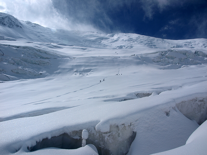 Hm, jeśli chodzi o zaskakujące spotkanie, to przypomniała mi się pewna historia. Na Islandii poszłam sama na najwyższy szczyt Hvannadalshnúkur (2110 m). Góra jest niewielka, ale znajduje się na zdradliwym, dużym lodowcu Vatnajökull. Tam pogoda zmienia się co chwilę i często panują arktyczne warunki. Szczeliny przykryte są warstwą śniegu i łatwo zgubić się w zadymce. Nikt więc nie chodzi tam sam, bez liny i bez GPS-u… poza mną.