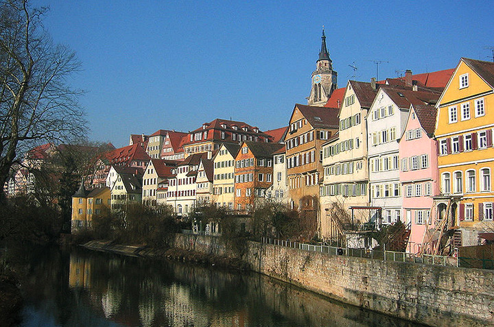 We wrześniu 1992 wracałem z Lizbony samochodem z lektorką języka portugalskiego w Warszawie Isabel Pinto i późnym wieczorem zatrzymaliśmy się we Fryburgu. Chcieliśmy tam przenocować, ale w jakimś tanim hotelu, poza centrum. Zobaczyliśmy po drodze taki skromny hotel i weszliśmy. Żywego ducha! Nawołujemy, czekamy, nic! Wreszcie Isabel położyła się na kanapie w hallu, a ja usiadłem na fotelu i tak przespaliśmy całą noc. Nikt się nie pojawił! Nad ranem umyliśmy się i ruszyliśmy do Tybingi, gdzie mieszka poznana w Lizbonie moja znajoma portugalistka Gudrun Plamper. Po drodze wynurzające się z mgły piękne pejzaże nad górnym Dunajem. U Gudrun była jej wesoła ciotka i razem poszliśmy na spacer po mieście. Na Starym Rynku kolorowy ratusz z XV z zegarem astronomicznym wykonanym w XVI w. przez Johannesa Stöfflera. Nad Neckarem stare kolorowe odbijające się w wodzie kamieniczki i Kolegiata (Stiftskirche) z XV w. Półokrągła baszta nad rzeką zwie się Wieżą Hölderlina (Hölderlinturm). Friedrich Hölderlin (1770-1843) był romantycznym poetą niemieckim i umarł właśnie w Tybindze. W wyższej części miasta zamek z XII w., obecnie hotel. Zdążyliśmy jeszcze zobaczyć słynny uniwersytet założony w XV w. Budynek zwany Neue Aula zbudowano w 1846 r.