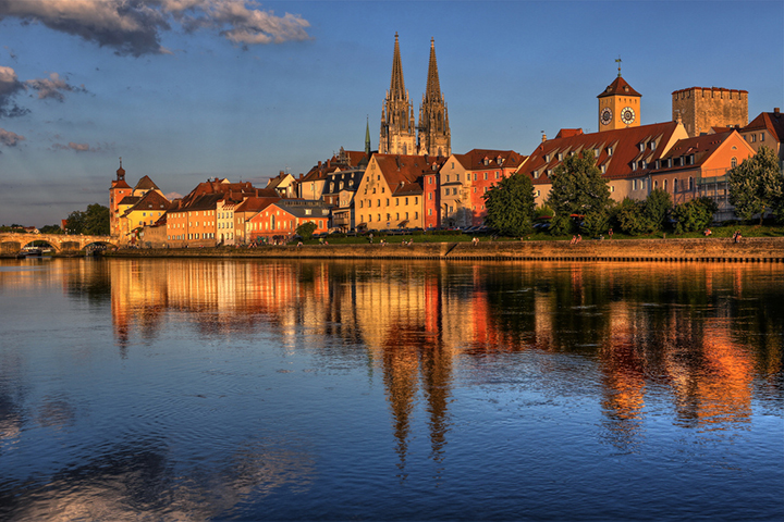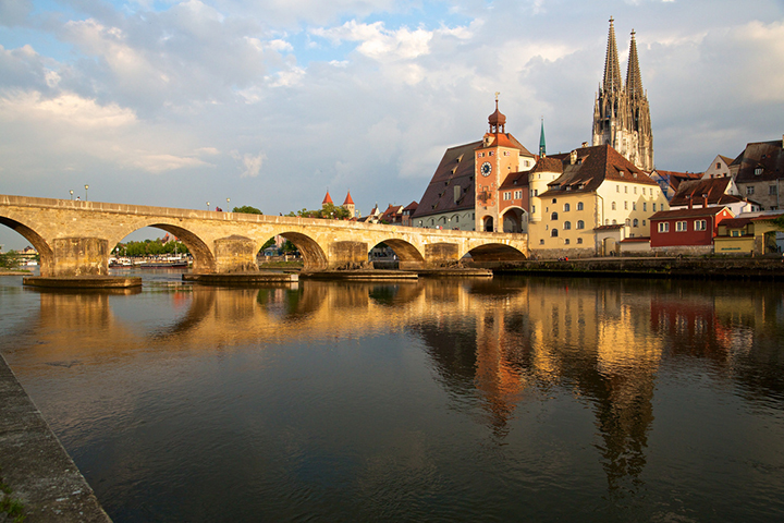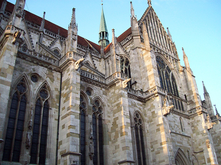 Już wieczorem wychodzę na spacer w kierunku Kamiennego Mostu (Steinerne Brücke) na Dunaju. Pochodzi z XII w. Z mostu widok na gotyckie wieże katedry św. Piotra, XIII-XVI w. Nazajutrz, 15 czerwca, rozpoczynam zwiedzanie właśnie od katedry. Wspaniały gotycki portal z posągami świętych. Potem Dolny Klasztor (Niedermünster), wzniesiony w XII w., z barokowym wnętrzem z XVIII w., kościół św. Ulryka, zbudowany w XIII w. i przecudowna rokokowa Stara Kaplica (Alte Kapelle), pełna koronkowych sztukaterii, złoceń i malowideł z XVIII w., dzieło Antona Landesa. To tu znajduje się słynny obraz Matki Boskiej w stylu bizantyjskim, zwany Obrazem Miłosierdzia (Gnadenbild). Na obiad Helmut zaprasza do restauracji „Dampfnudel-Uli”, gdzie rodzaj słodkich prażochów polanych śmietaną. Po obiedzie przez Kamienny Most na wyspę na Dunaju. Sielankowe obrazki domków otoczonych ukwieconymi ogródkami. Nagle znalazłem się na wsi. Jeszcze długi spacer do Wschodniej Bramy (Ostentor) z przejazdem pod wysoką wieżą obronną i dwiema niskimi basztami do niej przyklejonymi.