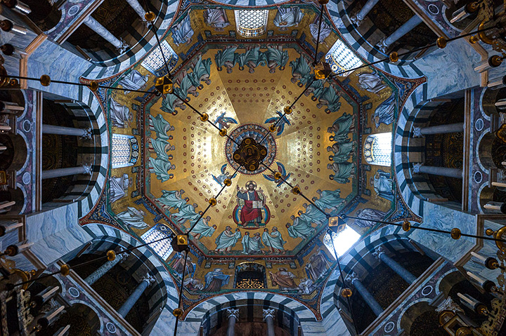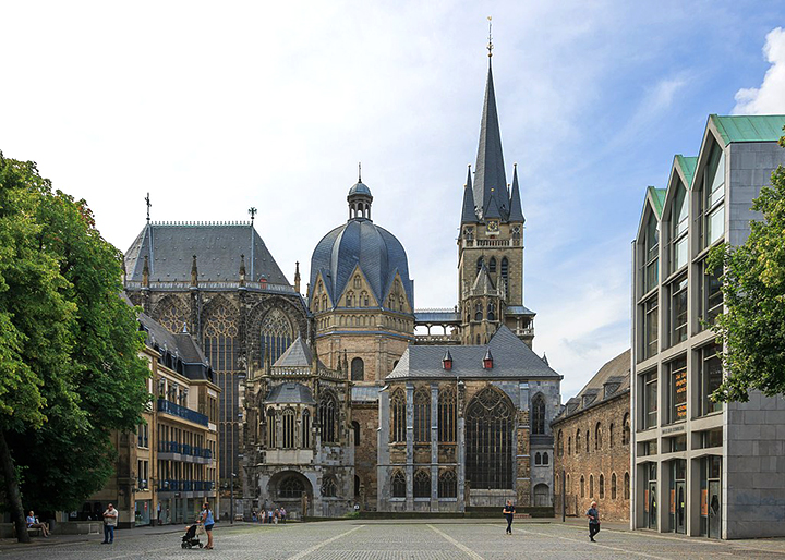 W czerwcu 1996 przebywałem w Liège (Leodium) w Belgii i stamtąd udałem się pewnego dnia pociągiem do pobliskiego Akwizgranu, rezydencji Karola Wielkiego. Ośmiokątna kopuła i cała kaplica cesarska pod nią pochodzą z początku wieku IX w., zaś przepiękny gotycki chór z XV w. Wewnątrz wspaniała złota szkatuła Karola Wielkiego z XIII w. Jednym z najstarszych domów jest gotycki Grashaus z XIII w., ozdobiony posągami w niszach na najwyższym piętrze. Wielki ratusz oraz kamienica Löwensteina w rynku są także gotyckie i pochodzą z XIV w. Warowna brama Marchientor została ukończona na początku XIV w. i wchodziła w skład murów obronnych miasta. Przed ratuszem posąg Karola Wielkiego w zbroi i z cesarskimi insygniami, z XVII w. W parku zdrojowym pseudorokokowy Pawilon Couvena, postawiony po II wojnie.