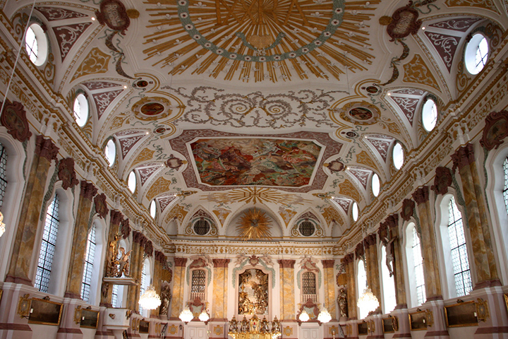 Skromna fasada kościoła o nazwie Bürgersaalkirche (Mieszczańska Sala) kryje wewnątrz pyszne barokowe wnętrze z XVIII w., niesłychanie eleganckie i w najlepszym guście. Pozostał mi jeszcze Plac Mariacki (Marienplatz), z Kolumną Matki Boskiej (Mariensäule) i dwoma gotyckimi ratuszami, Starym i Nowym (Alt und Neues Rathaus). Zwłaszcza ten Nowy jest niezwykle imponującą budowlą, z bardzo wysoką, strzelistą wieżą, u podstawy której wnęka z kurantami ozdobionymi barwnymi postaciami średniowiecznych mieszczan. Tak czy owak upał i przewalające się po Starym Mieście straszliwe tłumy ludzi zniechęciły mnie całkowicie do dalszego zwiedzania miasta.