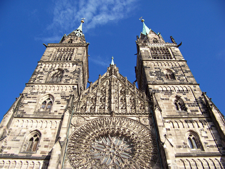 Nazajutrz, w niedzielę, 19 czerwca, Helmut odprowadza mnie na dworzec i odjeżdżam już z bagażami do Norymbergi, skąd wieczorem powrót do Wrocławia. Najpierw gotycki kościół św. Wawrzyńca (Sankt Lorenz Kirche), niedaleko dworca w Norymberdze, XIII-XIV w. Strzeliste gotyckie wieże, wnętrze wypełnione polichromowanymi rzeźbami świętych i proroków, w tym dzieło pochodzącego właśnie z Norymbergi Wita Stwosza, Pozdrowienie Anielskie (Engelsgruß). Całe Stare Miasto w Norymberdze zostało odbudowane po zniszczeniach wojennych z kamienia w tonacji różowo-pomarańczowej. Właściwie nie uratował się żaden obiekt zabytkowy. Trzeba przyznać, że naprawdę znakomicie je odbudowano. Nieco mniej monumentalny jest gotycki kościół św. Sebalda z XIII w., także dwuwieżowy i także wypełniony pięknymi malowidłami i rzeźbami, w tym cudowny krucyfiks z postaciami Matki Boskiej i św. Jana, dłuta Wita Stwosza. Kolejny wspaniały zabytek gotycki to kościół Mariacki (Frauenkirche) z XIV w., z pięknym wyposażeniem malarskim i rzeźbiarskim. Wyróżnić należy piętnastowieczny ołtarz rodziny Tucherów (Tucher Altar). Na placu obok, niezwykle ozdobna, otoczona żelaznym ogrodzeniem gotycka Piękna Fontanna (Schöne Brunnen), gęsto udekorowana polichromowanymi rzeźbami świętych, proroków, aniołów, absolutne gotyckie cacko. Jak na fontannę jest bardzo wysoka, sięga 19 metrów.