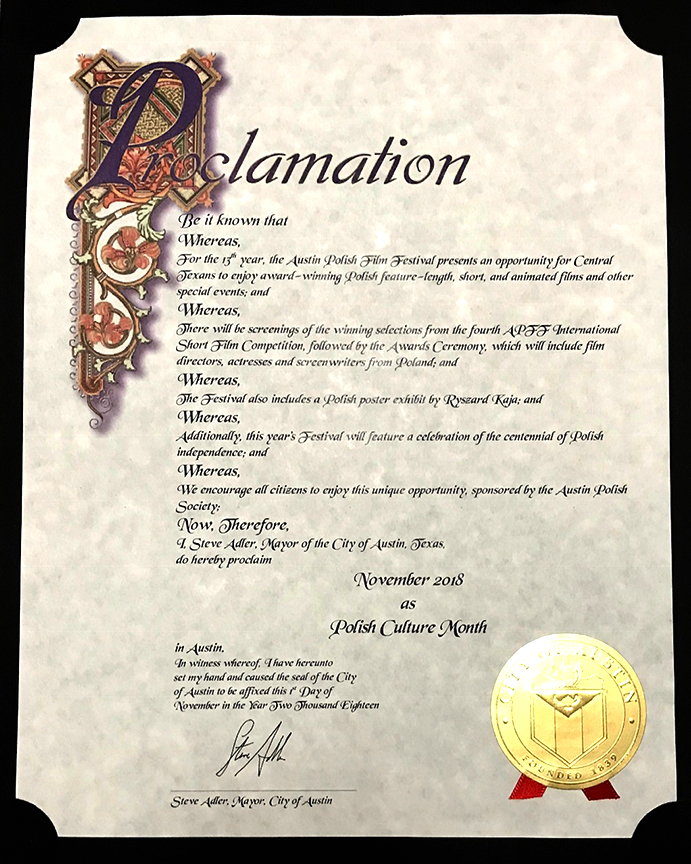 Burmistrz miasta Austin, Steve Adler, ogłosił listopad 2018 r. Miesiącem Kultury Polskiej.