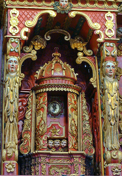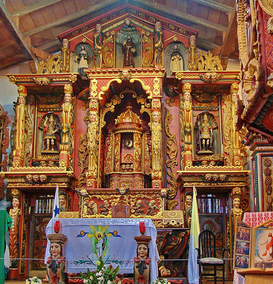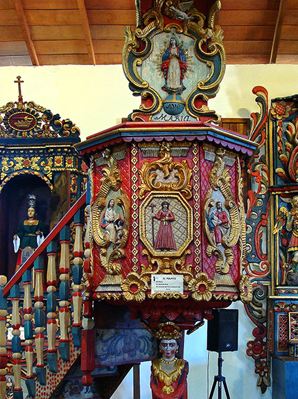 Niedziela, 8 lutego. Wyprawa autobusem do kościoła Św. Franciszka z Asyżu w San Francisco de la Montaña, z 1727 roku. Odległość 270 km. Towarzyszy mi Carlos, mąż Doñii Neli. W autobusie bardzo głośna muzyka – hałas nie do zniesienia! W niepozornym na zewnątrz kamiennym kościółku wewnątrz orgia barw i form. Drewniane, polichromowane ołtarze, wielobarwne kariatydy zwane cholas (dziewczyny), kandelabry, świeczniki, ambona – wszystko przepięknie wyciosane i wyraziście pomalowane. Postaci mają twarze wybitnie indiańskie. Widać, że artystami byli autentyczni Indianie. Dużo w tym wszystkim szczerej naiwności, ale jakie wspaniałe wyczucie barw, wśród których przeważa czerwień. Absolutny klejnot sakralnej architektury baroku. Wszystko tutaj przykuwa wzrok. W drodze powrotnej kościół Św. Jakuba Apostoła w Natá de los Caballeros, XVII-XVIII w., o cudownej barokowej szerokiej fasadzie z jedną wysoką, masywną wieżą. Wewnątrz drewniany sufit wsparty na drewnianych kolumnach, złocone ołtarze.