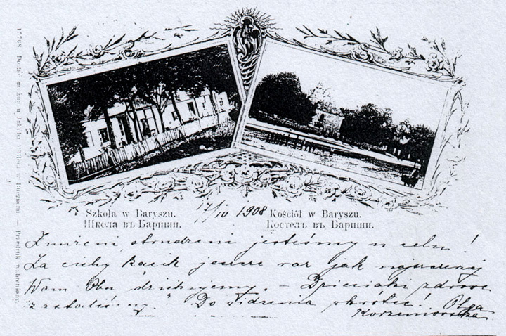 Na pocztówce adresowanej do Stefanii i Władysława Iżewskich (mojej ciotki i wuja), podpisały się obydwie siostry: Albina i Leopoldyna. Była to pocztówka z życzeniami na święta Wielkanocne w 1937 roku. Wysłana została z Barysza, o czym świadczy stempel na dwóch znaczkach pocztowych, jednym zielonym za 10 groszy przedstawiającym Morskie Oko w Tatrach, drugim za 5 groszy, przedstawiającym Pieskową Skałę. Szczęśliwych, miłych i wesołych świąt, szczerze oddane… pisała ciocia Lunia. Na odwrocie są ilustracje plebanii i kościoła (rok budowy: 1602, dopisała ciotka piórem), na drugiej szkoła powszechna z 1909 roku (też data naniesiona ręcznie).
