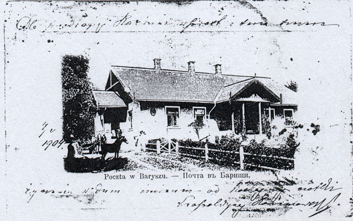 Pamiętać też warto, mówię sobie, tak pamiętać, by można było narysować z pamięci, jeszcze ładniejszy dom ciotek matki, Korzeniowskich. Był on nie w Buczaczu, lecz w położonym 15 kilometrów od Buczacza Baryszu, miasteczku liczącym przed wojną, czyli przed dwudziestowiecznym potopem, 5 tysięcy mieszkańców, w tym 3000 Polaków i 2000 Ukraińców. Polacy, którzy tam mieszkali, pochodzili przeważnie z Mazowsza. Wieś była własnością książąt Świdrygiełłów, których dwór stał na uboczu, dobrze wrośnięty w ziemię. Zabudowania miasteczka biegły po dwóch ramionach kąta prostego, z których jedno było polskie, a drugie ukraińskie. W miejscu przecięcia się ramion był duży plac, przy którym stał kościół, cerkiew, szkoła i karczmy żydowskie, wszystko w najlepszej zgodzie. Szkoła i kościół widnieją na pocztówce z 1908 roku podpisanej przez Olgę Duńczewską, żonę Henryka Korzeniowskiego, który był sędzią w Radziechowie. W tej szkole uczył mój pradziad, a także dziadek Jan Czekanowski.