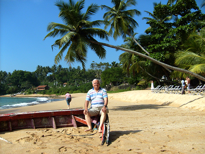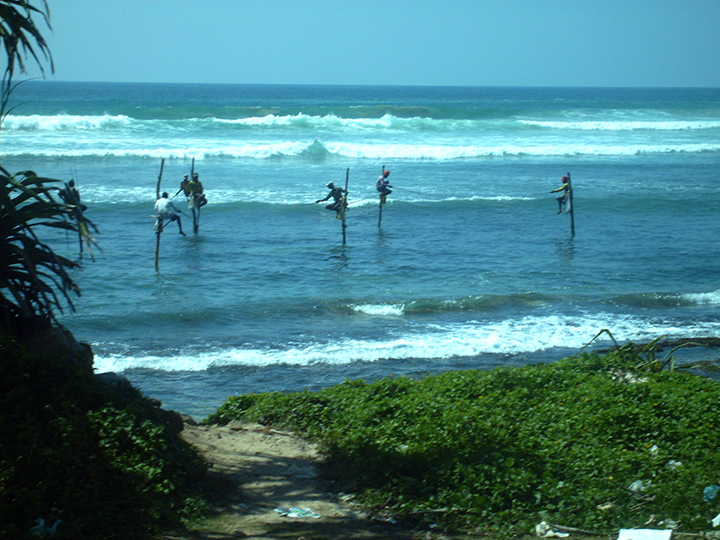 Zatrzymujemy się przy małej, uroczej plaży na samym południu wyspy. Ocean tworzy tu zatoczkę w kształcie podkowy, a nad plażą pochylają się nisko trzy wygięte palmy kokosowe. Idylla! Ale morze dość rozfalowane. Nieco dalej, postój przy pozujących rybakach „na szczudłach”. Wbite w dno morskie długie pale z miejscem siedzącym dla rybaka pozwalają łowić ryby z tej wysokości nad mocno wzburzonym morzem. Kawałek dalej ci rybacy już nie pozują, lecz zajęci są połowem i tu robię trzy udane zdjęcia.