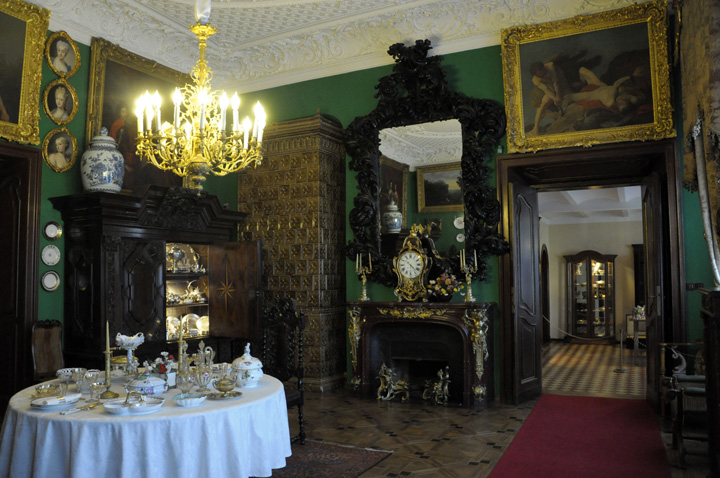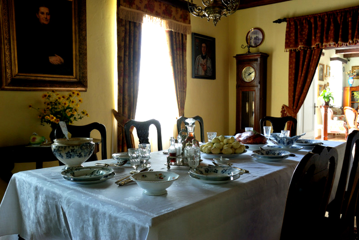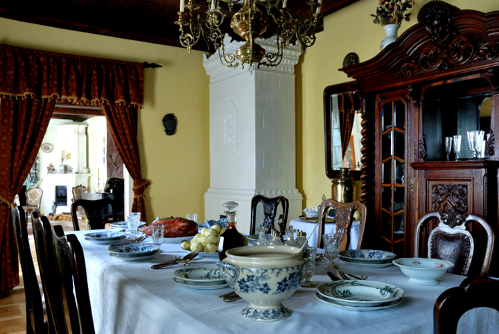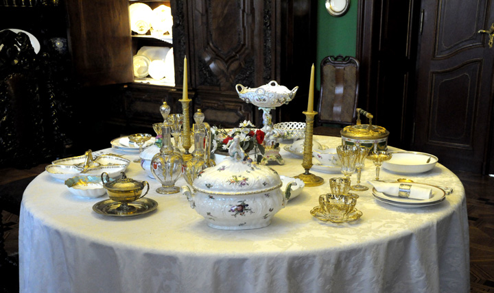 …Od połowy panowania Augusta III nastały talerze farfurowe, dalej porcelanowe, nareszcie cała służba stołowa składała się u wielkich panów z porcelany: wazy, serwisy, misy, półmiski, salaterki, talerze, solniczki, karafinki, trzonki nawet u nożów i widelców porcelanowe; (…) kieliszki zaś małe do wina stawiano z osobna przed każdego tudzież butelkę z winem i wodą i szklankę do niej przed każdą osobę. Jeżeli kto żądał piwa, to na tacy roznoszono w szklankach dla siedzących u stołu. Gdy zaś ta moda nastała, już wtenczas przy całym stole od końca do końca kładziono talerze, serwety, noże i widelce, za każdą potrawą odmieniano talerze, a nawet noże i widelce, przepłukując je w wodzie. Do brania potraw z wazów i półmisków były osobne łyżki duże, także do rozkrawania pieczystego osobne noże i widelce. Na ostatku, aby na niczym nie zbywało wykwintności, na każdym talerzu kładziono po kilka drewienek bukszpanowych, cienko i kończysto zastruganych, do wykulania zębów. (…) Liberia służyła do stołu, podając i odbierając talerze przez serwetę, ażeby golą ręką niezgrabną na czas lokaj lub hajduk pieszczonemu smakowi nie sprawił obrzydzenia. Toż samo zachowywał kuchmistrz, zastawiający stół potrawami, i roznoszący półmiski lokaje.