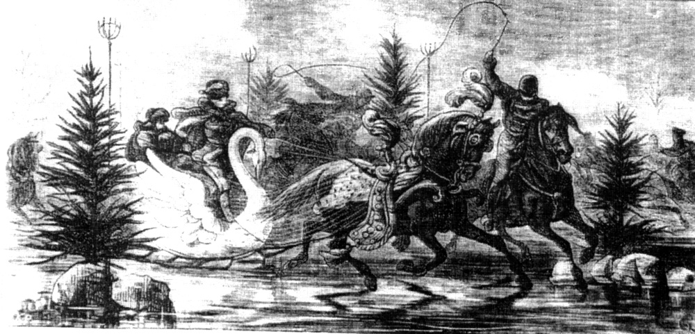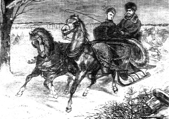 Sznur saneczek mknął raźnie i szybko. Towarzyszyła saniom młodzież na koniach z pochodniami w ręku, rozświetlając ciemności i płosząc liczną, leśną zwierzynę.