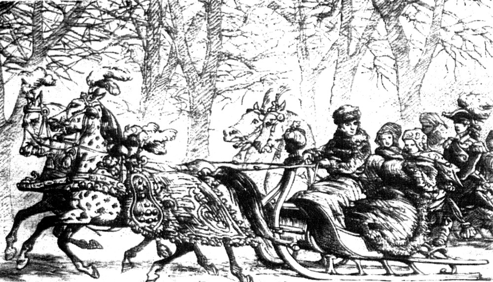 Kulig taki, coraz to liczniejszych mający uczestników, wędrował od dworu do dworu popasając, bawiąc się i goszcząc nieraz i po kilka dni. Była to okazja do odwiedzin familijnych, do poznania się młodych i do wielu radości, popisów uciech i psot. Nade wszystko była to okazja do błyśnięcia dowcipem i dobrym pomysłem na saneczki, które musiały być niezwykłe. Rzeźbiono więc sanie w kształcie niedźwiedzia, jelenia, konia koguta, łabędzia, lwa, muszli i fantastycznych stworów. Nieraz były to całe kompozycje wielofiguralne, głowy murzynka na rufie albo ptaka rajskiego, papugi, węża itp. Nawet w największym tłoku każdy łatwo rozpoznawał swoje sanie. Po leśnych, wąskich drogach pędziły zaprzęgi jednokonne. Zazwyczaj dama siedziała w saniach opatulona baranicą i kapłonim zarękawkiem (mufką z piór kogucich), a mężczyzna powoził z tylnego koziołka. Obejmując damę serca chronił ją swymi ramionami, szepcząc czułe słówka prosto do ucha.