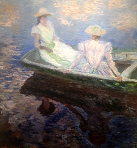 „Pływający świat” – to tytuł pierwszej sali poświęconej wczesnemu okresowi, latom 70. Są tu obrazy naśladujące styl Boudina, z którym młody Monet malował na plażach w Normandii, jest kilka pejzaży miejskich, jeszcze zatopionych w stylu realistycznym, ale już pojawia się szkicowość, szybkie malowanie w plenerze, fascynacja światłem słonecznym. Z tego okresu pochodzi „Bulwar Kapucynów” i obraz pokazujący pływające po wodzie atelier malarza – łódż, którą przysposobił, by malować na wodzie.