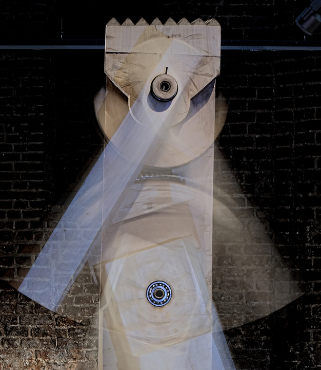 Two Towers (2015) rise up epigrammatically as wooden structures whose forms rise up, and their process is again awkward, with junctures between each section held in place by metal rods (the interaction between nature and human, or art and industry). One is reminded of early stone sculpture environments, the vertical intention of the human gesture in ancient times, reaffirmed here, but enigmatic, hard to truly “read”. The abstract merges with the figural, and we are led to question presence and absence. Living or dead? Containers or consciousness? Time flows. Litwiniuk’s retrospective at Gallery EL is a performative ritual, and the sculpture evidence of the temporal point of existence, manifest by machine cogs and wheels, sectional growths and abstract projections, all expressions of the creative impulse at a point in time. This point in time, where time itself unconsciously performs its process, while the artist performs his process – the evidence of these rituals of existence are these artworks – Open System – … Dot Dot Dot …