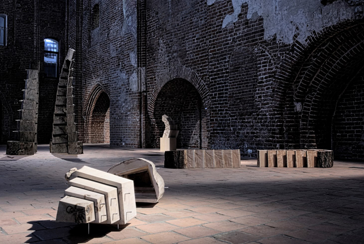 Full circle… Ryszard Litwiniuk first exhibited at Galeria EL twenty five years ago, and now again, he presents a full spectrum of works realized during this period. Living in an era described by some as the anthropocene, where humanity’s presence actually transforms the weather and climate systems as well as the physical topography of our earth, requires a reassessment of nature as medium, as backdrop for human activity. In one way, this directs us to look as Ryszard Litwiniuk’s transformative sculptures from the point of view of a nature increasingly categorized, quantified, indeed measured, while nature’s systems involve procreation, inimitable reproduction, and so the inter-textual play between man and machine, between procreation and manufacture we see with Litwiniuk’s art is incredibly relevant to our times. His interaction as a sculptor is human, textural, and tactile, involves physical dimensionality, and plays off beautifully within the context of this restored Dominican Gothic church that became a nexus point for art exhibition and publication in Poland initiated in 1961 by Gerard Kwiatkowski, attracting such sculptors as Magdalena Abakanowicz and many other artists for their Biennial of Spatial Forms (begun in 1965), who would later become “names” in the art world.