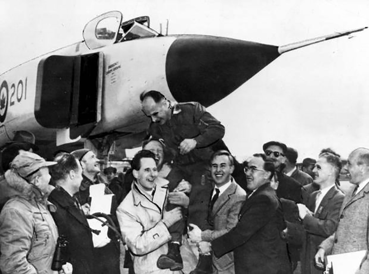 Janusz Żurakowski na ramionach kolegów po pierwszym locie Avro Arrow, 25 marca 1958 r.