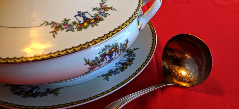 Kolekcja porcelany firmy Noritake i srebrnych sztućców firmy Oneida Community – wzór „Modjeska” wraz z informacją o firmach Noritake i Larkin.