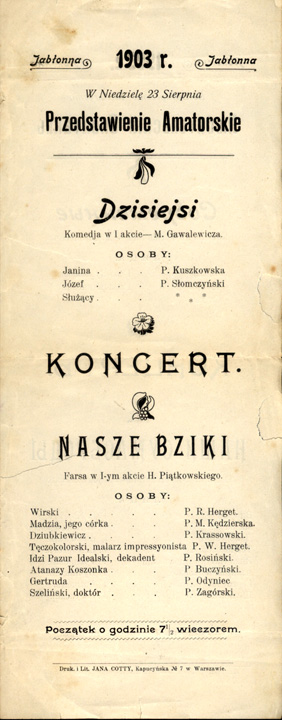 Przedstawienie powyższe dokumentuje drugi zachowany plakat. Mały, dwustronny, skromny w formie. Sugeruje bardzo niską cenę druku. Prawdopodobnie po roku 1903 przedstawienia teatru nie odbywały się aż do 1907 roku. Dlatego też z tego okresu nie ma plakatów i choćby najdrobniejszych wzmianek w prasie o przedstawieniach.