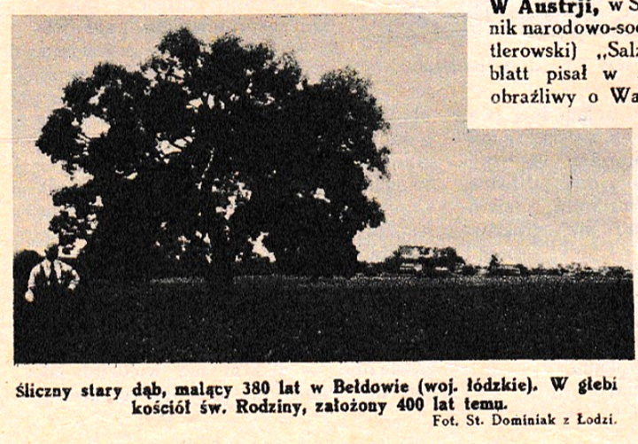 Bełdów, Bałdów, wieś z przyległościami (…) na lewo ode drogi z Aleksandrowa do Poddembic, o 21 wiorst od Łodzi, we wzgórzystem położeniu nad Bałdówką, posiada kościół parafialny drewniany, urząd gminny, sąd gminny, szkołę gminną, gorzelnię i młyn wodny. W 1827 r. było tu 27 domostw i 373 mieszkańców. Parafia Bełdów dekanatu łódzkiego ma 2471 dusz (notatka na temat Bełdowa w XIX wiecznej gazecie).