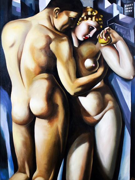 – Byłam w mojej pracowni w Paryżu – pisała Tamara Łempicka nt. powstania tego obrazu – i malowałam tę dziewczynę, doskonałą piękność, klasyczną. Ona chodziła zupełnie naga i podeszła do dużego stołu, na którym były owoce, pięknie ułożone. Spytała „czy mogę wziąć jabłko?”. Odparłam „naturalnie, śmiało”. Wzięła jabłko i podniosła do ust. A ja powiedziałam „nie ruszaj się, wyglądasz jak Ewa. Potrzebny nam Adam”. I wtedy przypomniałam sobie, że ulicę przy której był mój dom patroluje pewien policjant. Powiedziałam, „poczekaj chwilę” Wyszłam z pracowni i zobaczyłam policjanta. Podeszłam do niego i powiedziałam „jestem malarką. Zna mnie Pan?”. Odpowiedział „o tak, znam panią i mam reprodukcje pani obrazu”. A ja powiedziałam „czy przyszedł by pan mi pozować do obrazu?” Spytał „kiedy?”. „Jutro” odparłam. „Przyjdę”. Nie mogłam uwierzyć.