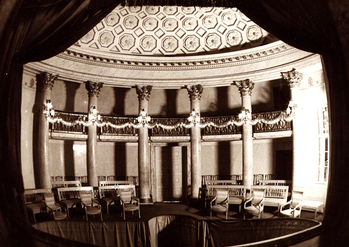 Wróciwszy do sali paradnej, wchodzi się z tejże przez drzwi kryte, zwierciadłem wyłożone do Teatru – to jest Sali dawniej na teatr przeznaczonej, w której wszelkie urządzenia sceniczne, jakoteż na pomieszczenie widzów znajdują się.
