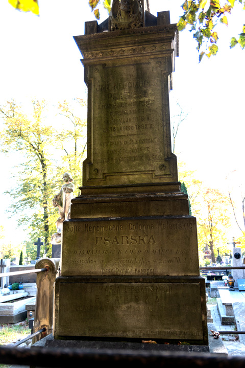 W grobowcu leży też córka Józefa Żarskiego i Józefy z Psarskich – Wacława z Żarskich Sokołowska. To pierwsza żona mojego dziadka – Wincentego Sokołowskiego. W naszych dokumentach rodzinnych zachował się list dziadka do jego ojca Mieczysława z prośbą, żeby się oświadczył rodzicom panny Wacławy w jego imieniu. Oświadczyny jak widać zostały przyjęte. Dziadek Wincenty, ur. w 1888 r. był inżynierem leśnikiem po studiach we Lwowie. Odbywał praktyki leśne podczas studiów u Zamojskich w Łochowie, po czym otrzymał propozycję pracy jako nadleśniczy w dobrach łochowskich. Ze świeżo poślubioną żoną zamieszkał w Łochowie. Młodzi otrzymali dwór na terenie posiadłości, w którym mogli zamieszkać. Niestety w 1921 roku zdarzył się tragiczny wypadek. Wacława zasnęła nad książką, którą czytała przy lampie naftowej, od lampy zapaliły się jej włosy i spłonęła, a z nią duża część dworu. Miała 30 lat. Została pochowana w Piotrkowie. Dziadek po tej tragedii wyjechał z Łochowa, aż na granicę z Prusami Wschodnimi. Został nadleśniczym ogromnych terenów lasów państwowych w Nadleśnictwie Lidzbark, nad rzeką Wel i jeziorem Lidzbarskim i funkcję tę pełnił aż do wybuchu wojny. Potem wrócił z rodziną do Piotrkowa.
