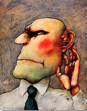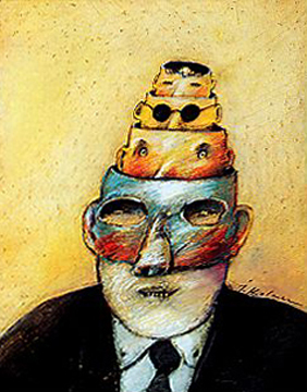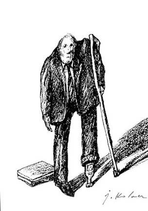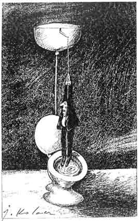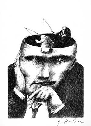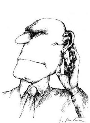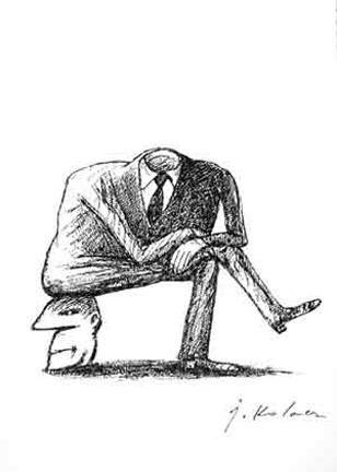 Prace Jerzego Kołacza (1938-2009) są znane, nie tylko w kręgach koneserów i nie tylko w Polsce, Kanadzie czy Stanach Zjednoczonych. Jego obszar poszukiwań twórczych był szeroki, ale nie jest to sztuka popularna i łatwa, mimo, że pełni rolę sztuki użytkowej. Rysunki, grafiki, plakaty, okładki książek czy ilustracje odwołują się do intelektu i spostrzegawczości odbiorcy. Czasami, dla bystrego obserwatora są czytelne i oczywiste od razu, a czasami trzeba je studiować, zagłębiając się stopniowo w labiryncie powiązanych ze sobą skojarzeń. Są rebusami ludzkich przywar i ułomności, obrazują ukryte myśli większej części ludzkiej populacji. Zdają się wołać: „To my-ludzie”, „To nasz świat”. Nie ten z reklam, afiszów, kina telewizji i całej reszty popkultury. Nie jesteśmy piękni, młodzi, o nieskazitelnej urodzie duszy i ciała. Jesteśmy ułomni, egoistyczni i sprośni. Myślimy o sobie, pieniądzach, seksie i wielu, wielu innych rzeczach, które zwykle nie są przedmiotem rozmów towarzyskich. Nasz świat zewnętrzny ukryty jest w naszej głowie, zamknięty szczelnie w naszych myślach. Jerzy Kołacz w swojej twórczości graficznej i ilustratorskiej próbował dociec sedna motorów kierujących ludzkim postępowaniem i przedstawiał je w sposób karykaturalny lub groteskowy. Dość częstym elementem jego prac jest otwarta głowa, można więc „zajrzeć” do jej środka. Widać wtedy wyraźnie, że każdy tak na prawdę prowadzi swoją politykę „grając własną grę pionkami i na głowie kogoś drugiego”, że to kobieta kieruje postępowaniem mężczyzny „rozniecając iskrę w jego głowie” itd. Innym charakterystycznym elementem prac są ręce. Np. podając komuś rękę ukrywamy w niej węża. Ważną rolę w twórczości artysty odgrywają wyraziste gesty. To one zwracają uwagę widza kierując jego odbiorem.