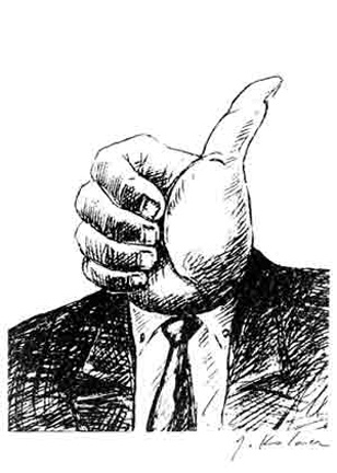 Pamiętam jedną z wystaw w Toronto zorganizowaną przez GabaArt Gallery pt. „Oczami artysty”. Została wtedy zaprezentowana jedynie sztuka użytkowa Jerzego Kołacza, w postaci grafik, rysunków, ilustracji, prac czarno-białych i kolorowych. W czasach, gdy popkultura kreowana przez media stara się zawładnąć ludzkimi umysłami, ta intelektualna zabawa z widzem ma ogromne znaczenie. Przewidywania zarówno Georga Orwella („Rok 1984”), jak i Aldousa Huxleya („Nowy wspaniały świat”) zdają się sprawdzać. Zagraża nam zarówno rozwijająca się technologia, która sprzyja ingerowaniu w nasze wnętrze, pozbawiając nas autonomii, jak i możliwość pokochania opresyjnego systemu reklam i adorowanie wszystkich osiągnięć techniki współczesnego świata, ograniczających zdolność naszego myślenia. „Wszystko, co musi pani zrobić, to włączyć przycisk i cały świat: komedię, dramat, wszystkie barwy życia ma pani w zasięgu ręki” – powiedział sprzedawca instalujący telewizor w filmie z lat 50-tych pt. „Wszystko, na co niebo zezwoli” Douglasa Sirka. Teraz doszedł bombardujący nas świat wirtualny, który z jednej strony, skraca drogę komunikacji międzyludzkiej, ale z drugiej staje się zagrożeniem dla indywidualności i może prowadzić do uzależnienia światem nierzeczywistym.