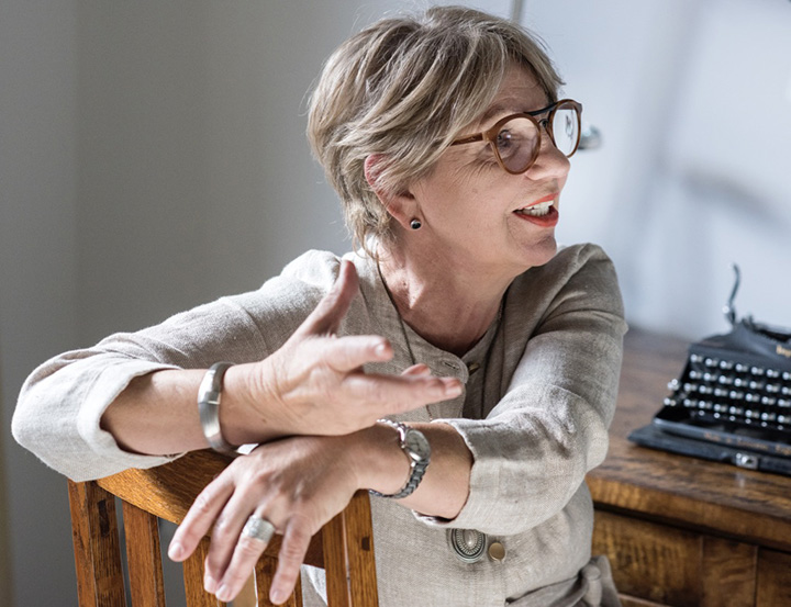 w swojej twórczości angażuje się w problematykę społeczną. Nie ilustruje, lecz przedstawia własną wizję przeżyć, w której podkreśla klimat i atmosferę otaczającego ją świata. Interesuje ją malarska forma grafiki, stąd poszukiwanie nowych, mało znanych rozwiązań warsztatowych, jak ksylotypia czy centografia. (…). Prace przygotowuje dużymi cyklami starając się rozwiązać zamierzony cel.
