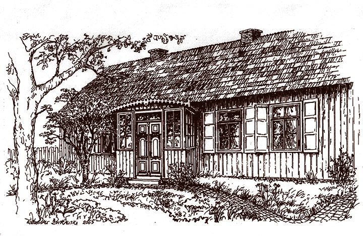 Sypialnia rodziców znajdowała się wtedy w pokoju od północy, oddzielonym od reszty domu przedpokojem. W pokoju jadalnym, centralnie położonym , było mnóstwo białych, filunkowych drzwi. Wchodziło się przez ganek i przedpokój na lewo do dużego pokoju, który długo był naszym dziecinnym, na prawo do małego pokoju-saloniku i do kuchni. Naturalnie, szerokie przeszklone drzwi z bocznymi, wąskimi oknami wychodziły na werandę i oświetlały ten przyciemnawy zwykle pokój malowany olejno w modne wówczas boazerie, niby deski na zmianę ciemne i jasne aż do sufitu. Pokój ten był najmilszy wieczorem, gdy gromadziliśmy się wokół dębowego stołu. Życie rodzinne miało wtedy swój niezrównany charakter ciepła i bliskości. W świetle secesyjnej lampy, której jeszcze szczątki istnieją, siadaliśmy do kolacji, a później każdy coś czytał, szył, czy rysował. Nie było przecież telewizji, więc wieczory były organizowane inaczej. Po wojnie ojciec głośno nam czytał historyczne książki. Latem, szeroko otwarte drzwi stwarzały szczególny urok tego wnętrza, zwłaszcza w porze obiadowej w słoneczne dni. Nigdy tu nie było upału, a zimą długie promienie kładły się w głąb sięgając stołu. Urocze było to nasze miejsce, takie przytulne i tak łatwe w kontakcie z ogrodem, gdzie jaśmin można było rwać z okna, a duże donice z drzewkami pachnących oleandrów, różowych i fioletowawych, zdobiły dookoła werandę, późnym latem pachniały floksy w różnych odcieniach barw.